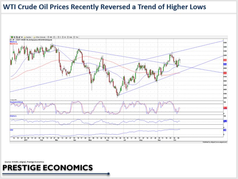 Στο μεταξύ, το μοτίβο συναλλαγών της τιμής του αργού WTI είναι επίσης υποστηρικτικό. Το WTI έκλεισε ένα τρίμηνο έντονης μεταβλητότητας, καθώς οι διακοπές στα διυλιστήρια που προκάλεσαν οι τυφώνες αρχικά εξασθένισαν τη ζήτηση, αλλά η επίδραση του τυφώνα Harvey επακόλουθα διεύρυνε τα περιθώρια διύλισης (γνωστά ως crack spreads), δίνοντας οικονομικό κίνητρο για αύξηση της παγκόσμιας ζήτησης των διυλιστηρίων για αργό, γεγονός που ώθησε τις τιμές υψηλότερα. Οι επακόλουθες στη θεμελιώδη ζήτηση των αμερικανικών διυλιστηρίων του Κόλπου ήταν αδύνατο να σταματήσουν την τεχνική τάση βελτίωσης των τιμών αργού WTI.