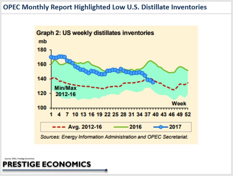 Πέραν της ήπιας μείωσης σε ετήσια βάση των αποθεμάτων βενζίνης και αργού πετρελαίου, τα διυλισμένα αποθέματα των ΗΠΑ (τα οποία περιλαμβάνουν το ντίζελ και το πετρέλαιο θέρμανσης) είναι 14,7% κάτω από τα επίπεδα του 2016 και κάτω από το μέσο επίπεδο των διυλισμένων αποθεμάτων της περιόδου 2012-2016. Αυτή η διαφορά είναι πιθανό να διασφαλίσει ότι οι αλλαγές στα αποθέματα των αμερικανικών πετρελαιοειδών θα παραμείνουν σημαντικές το χειμώνα. Στην πραγματικότητα, αυτή η δυναμική των διυλισμένων αποθεμάτων συγκαταλέγεται στα κυριότερα σημεία της έκθεσης του Οκτωβρίου του ΟΠΕΚ για την πετρελαϊκή αγορά.