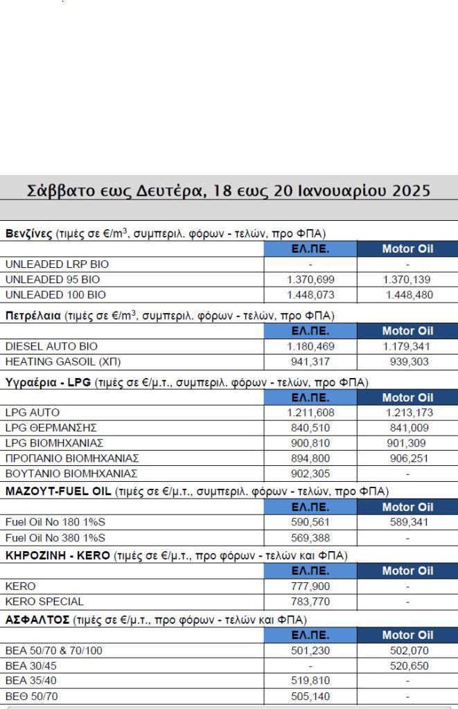 • ΚΟΣΤΟΣ ΚΑΥΣΙΜΩΝ ΕΛΠΕ 20/1/2025