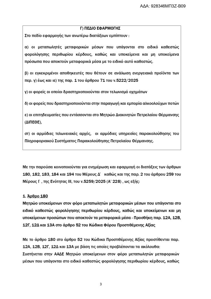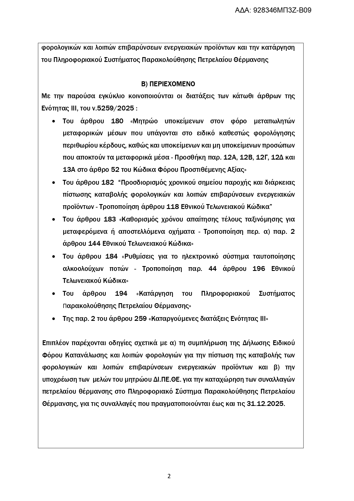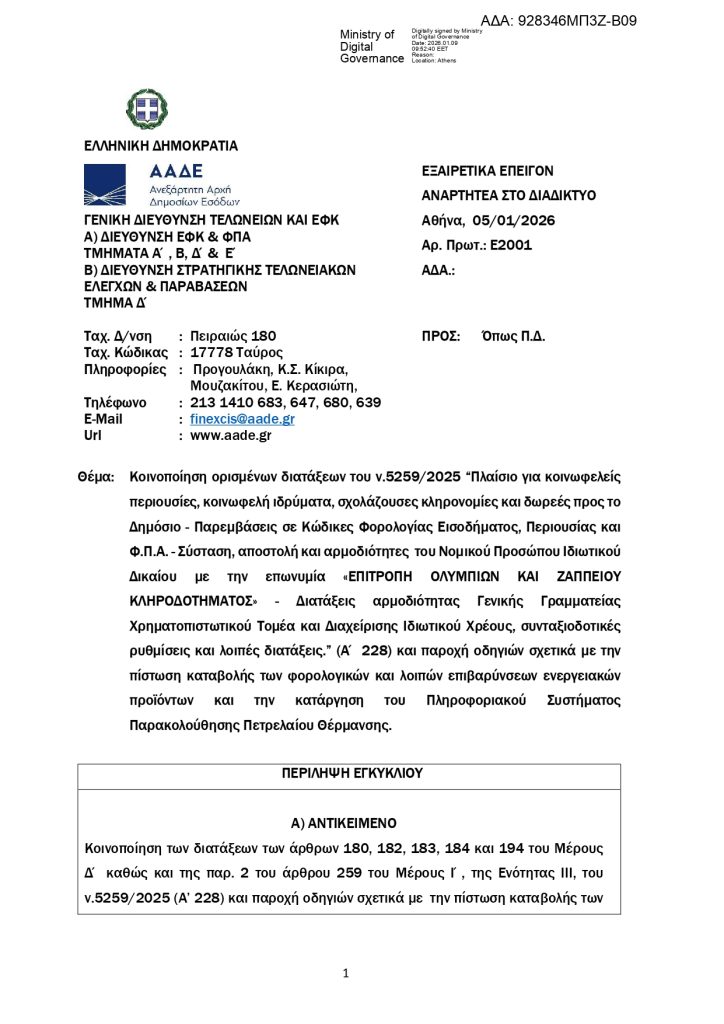 Κοινοποίηση ορισμένων διατάξεων του ν.5259/2025 “Πλαίσιο για κοινωφελείς περιουσίες, κοινωφελή ιδρύματα, σχολάζουσες κληρονομίες και δωρεές προς το Δημόσιο – Παρεμβάσεις σε Κώδικες Φορολογίας Εισοδήματος, Περιουσίας και Φ.Π.Α. – Σύσταση, αποστολή και αρμοδιότητες του Νομικού Προσώπου Ιδιωτικού Δικαίου με την επωνυμία «ΕΠΙΤΡΟΠΗ ΟΛΥΜΠΙΩΝ ΚΑΙ ΖΑΠΠΕΙΟΥ ΚΛΗΡΟΔΟΤΗΜΑΤΟΣ» – Διατάξεις αρμοδιότητας Γενικής Γραμματείας Χρηματοπιστωτικού Τομέα και Διαχείρισης Ιδιωτικού Χρέους, συνταξιοδοτικές ρυθμίσεις και λοιπές διατάξεις.” (Α΄ 228) και παροχή οδηγιών σχετικά με την πίστωση καταβολής των φορολογικών και λοιπών επιβαρύνσεων ενεργειακών προϊόντων και την κατάργηση του Πληροφοριακού Συστήματος Παρακολούθησης Πετρελαίου Θέρμανσης.